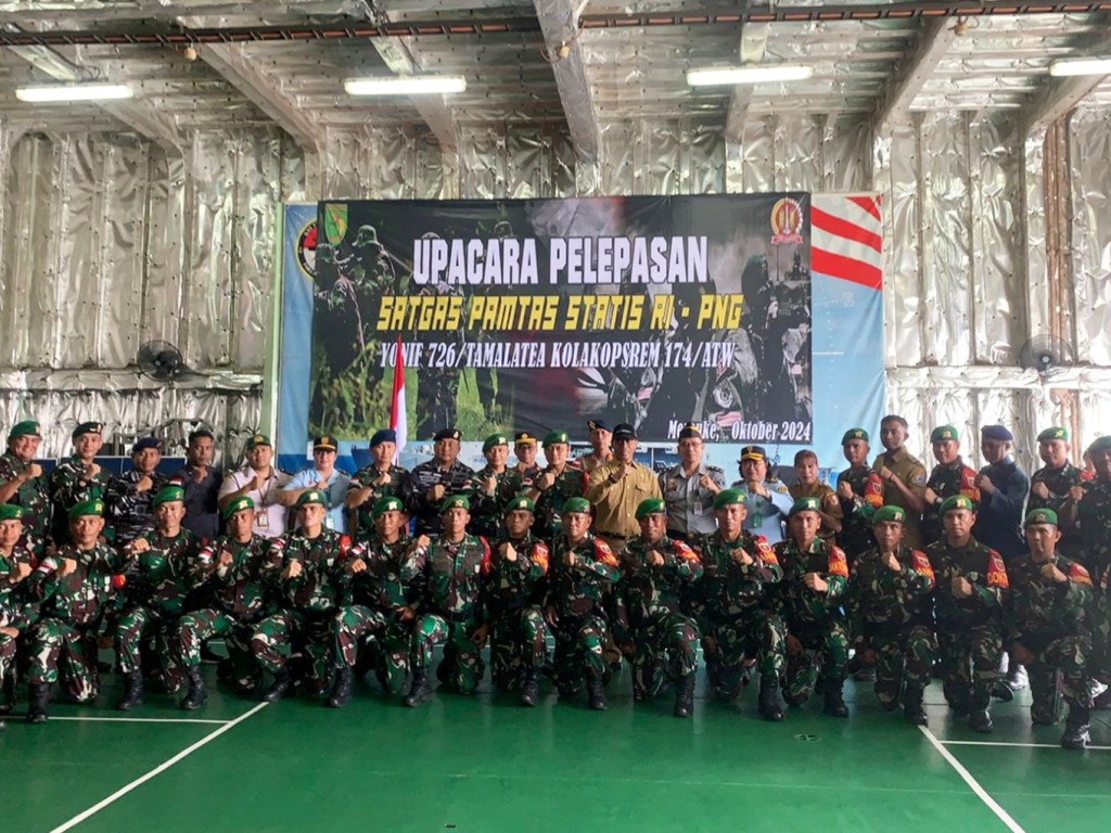 Acara pelepasan Satgas Pamtas RI-PNG yang dilaksanakan di Kapal KRI Teluk Palu – 523 dipimpin langsung oleh Komandan Korem 174/ATW Brigjen TNI Andi Setyawan, dengan Perwira Tertua Dansatgas Pamtas Statis RI-PNG Yonif 726/TML Letkol Inf Anta Sihotang yang turut dihadiri puluhan tamu undangan.